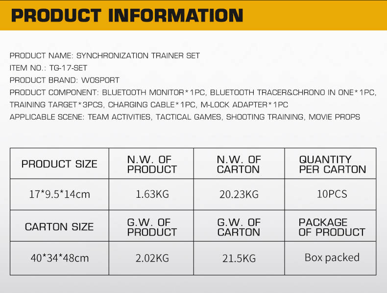 Product accessorie:Bluetooth Monitor*1pc,Bluetooth Tracer*1pc,Training Target*3pcs,Charging Cable*1pc,M-LOCK Adapter*1pc